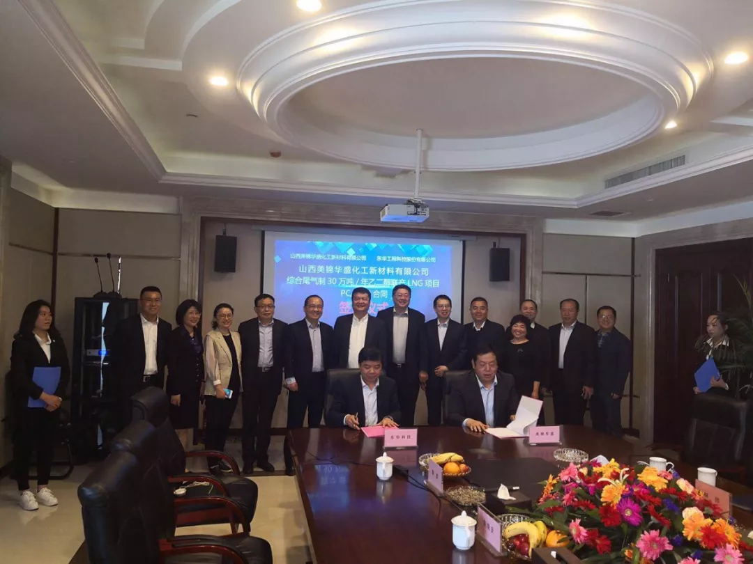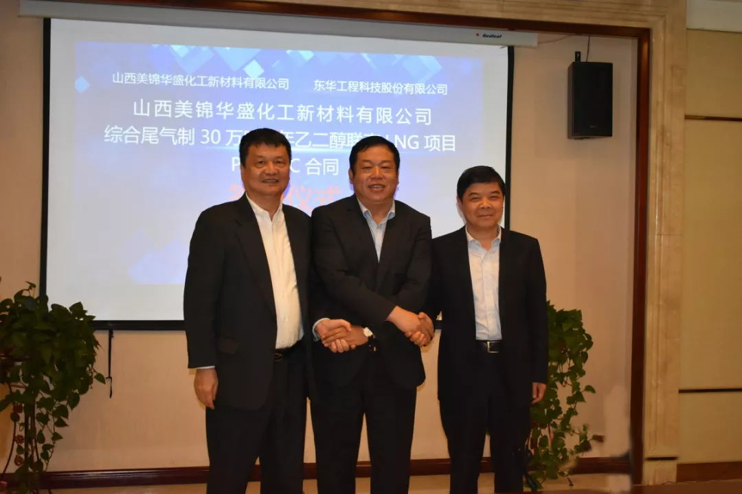4月19日,东华工程科技股份有限公司与山西美锦华盛化工新材料有限公司签订了山西美锦华盛化工新材料有限公司综合尾气制30万吨/年乙二醇联产LNG项目PC/PMC总承包合同。公司党委书记、董事长吴光美和山西美锦能源股份有限公司总裁姚俊卿代表双方在合同上签字。日本高化学株式会社社长高潮、北京兴高化学总经理高雷作为工艺包技术提供方出席了签字仪式。
