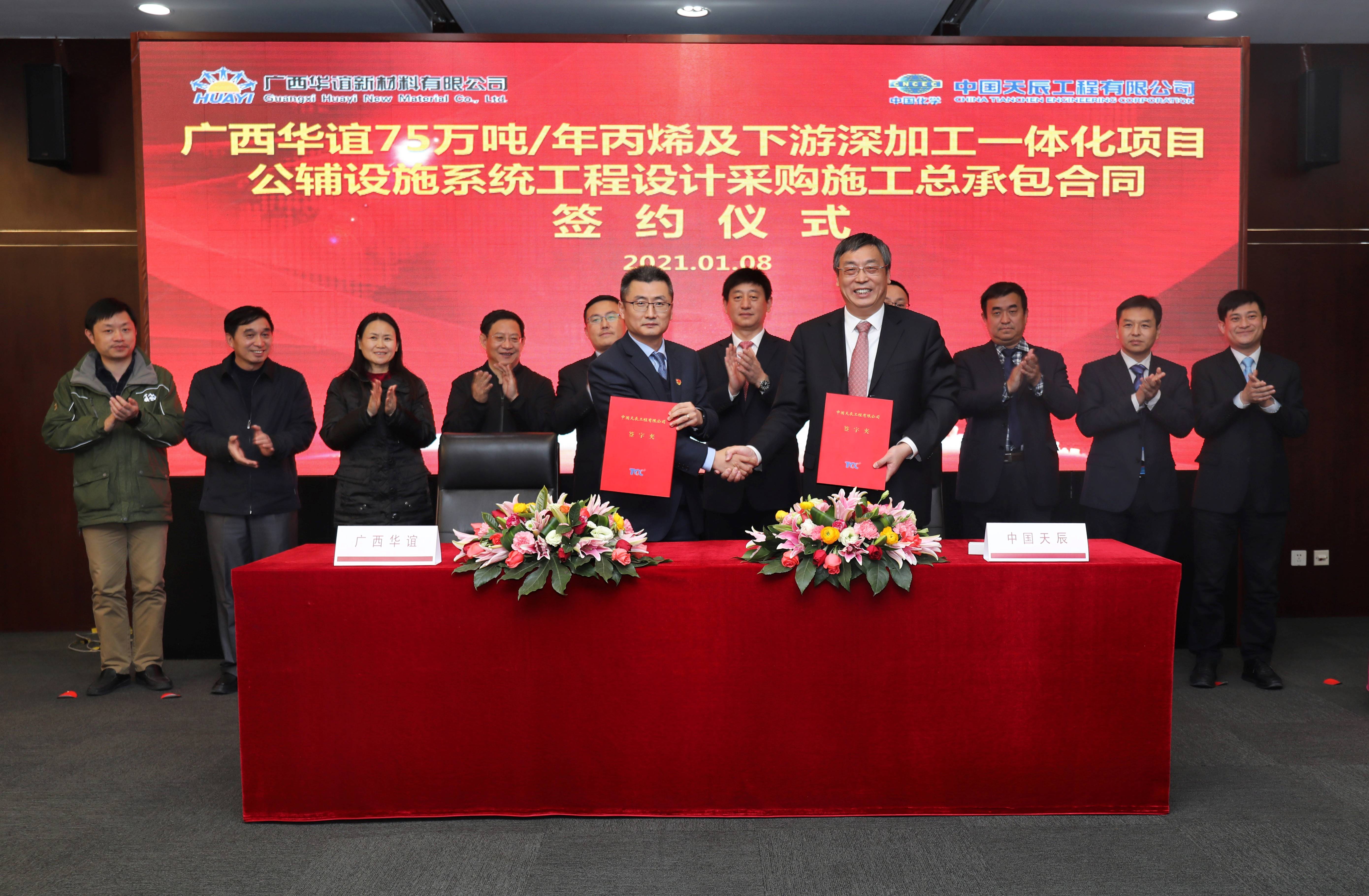 1月8日,中国化学中国天辰工程有限公司与广西华谊新材料有限公司在天津举行广西华谊75万吨/年丙烯及下游深加工一体化项目公辅设施系统工程设计采购施工总承包合同签约仪式。
